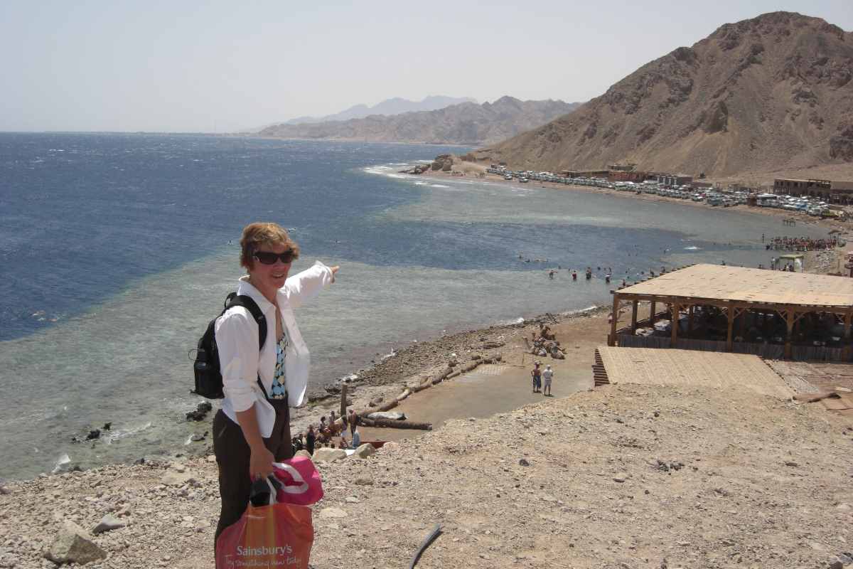 Time to go back to the Blue Hole and Lynn is not having anything to do with a camel. While we are messing around getting our camels loaded and ready to go she has set off and leads us all the way back to the Blue Hole. She makes better speed than the camels. After we have got off our camels we are walking the last stretch over a hill to the Blue Hole when Sharif points out a deal camel on the rocks below that had fallen from the path. Our assumptions that these creatures are sure footed was obviously mistaken, perhaps Lynn is right.