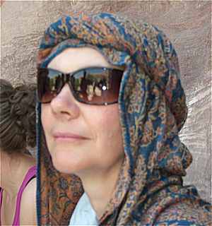 We drive around more of Wadi Rum exploring different vistas until we arrive at a place where there is an image of Lawrence carved in a rock. Nearby was a Bedouin tent that could be used by visitors travelling without a guide and another that was offering "Bedouin hospitality" and a few items for sale. We took the opportunity for a little hospitality. The tea was very good and Lynn bought some of the herbs and spices that they added to the tea to take home. I hope there are no funny ingredients and decide that I should pack it in Lynn bag in case the sniffer dogs at customs become interested :-). One of our drivers persuaded Rouge and Babe to try on some of the traditional women's head wear which looked ok if you ignored what they wore from the neck down!