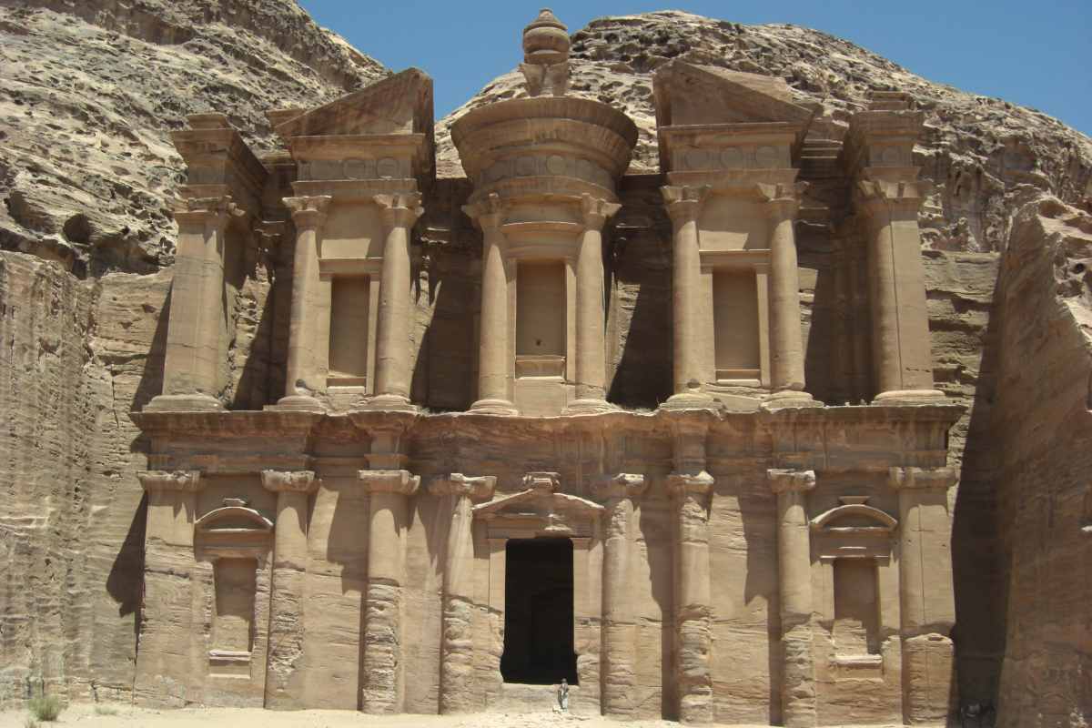 The trip up to Ad-Deir was supposedly 800 steps. As we started out I was reminded of Mt Sinai, in this case there were offers of donkeys rather than camels to take you to the top. The climbing was not difficult and there were sometimes long stretches between "steps". Some of the steps were very worn and indistinct and make the self imposed task of counting them quite challenging. At the highest point I had counted 784 steps. When I was standing at the highest point I did wonder if it had been worth the climb, al I could see were a few more caves one of which appeared to be a cafe. I set off towards the cafe and after a few steps Ad-Deir (The Monastery) comes into view on my right. The climb was worth it, The Monastery is the second best facade after The Treasury.