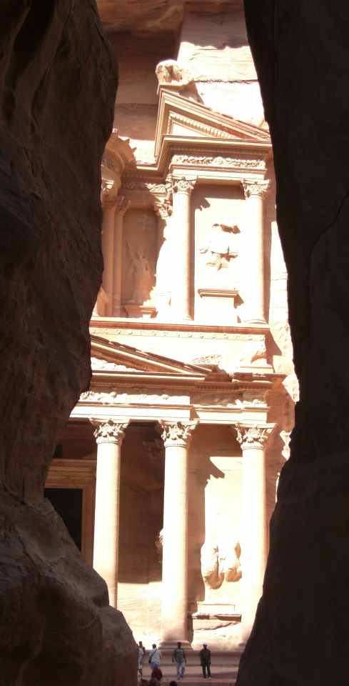 As you approach the end of the Siq you get your first glimpse of Al Khazneh (The Treasury). This is the first such structure that you see in Petra and probably the best of its kind. Like many others we spent a while looking around this area, we did not realise at that time how much more there is to see. The Treasury is mostly a facade, there is a large room cut into the rock behind but little else. The Treasury and similar elaborate "buildings" (caves?) were used as burial places.